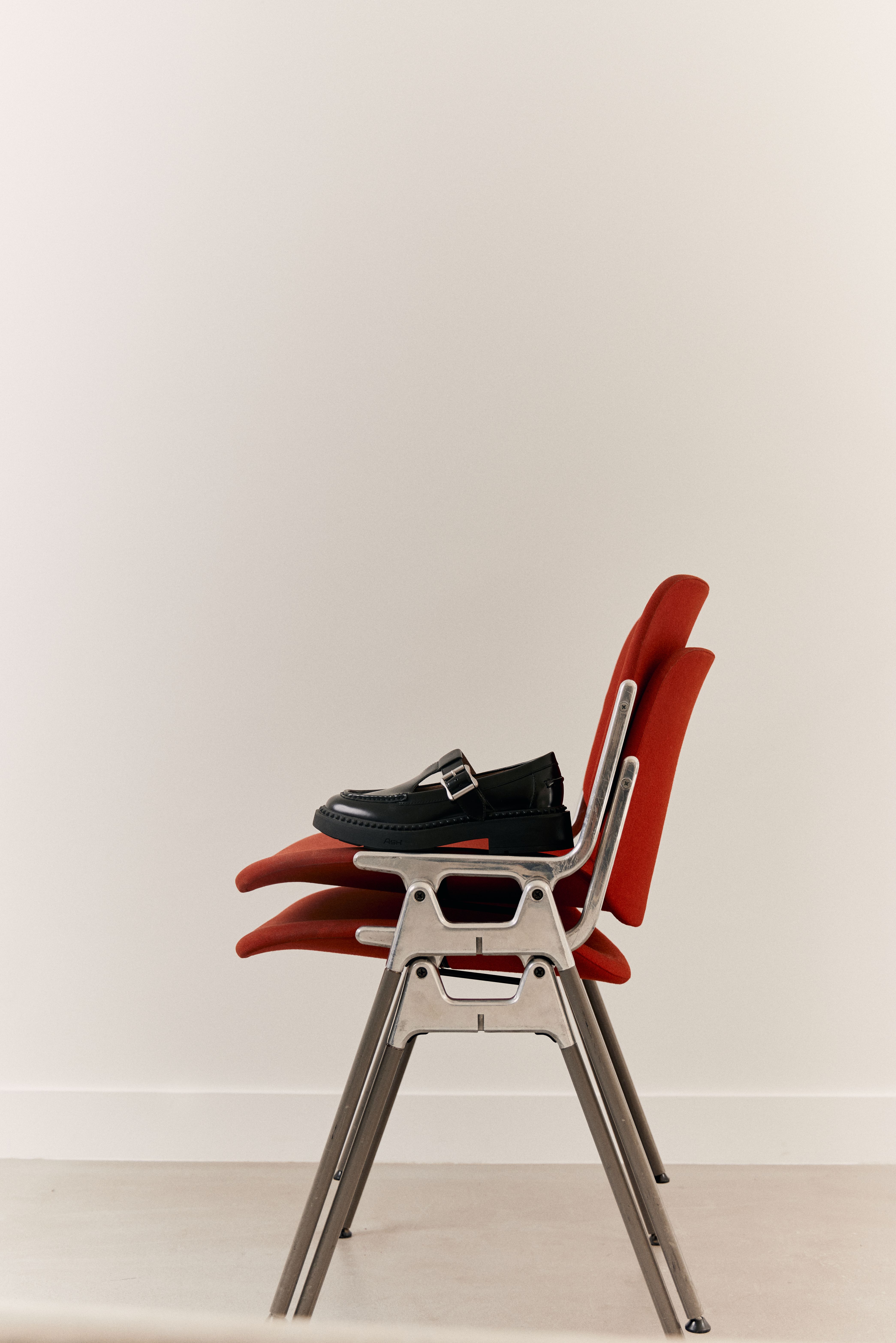 Crafted from premium leather with subtle stud details, these black loafers on red artistic chair are truly fashion-forward footwear. #mason #MERCER